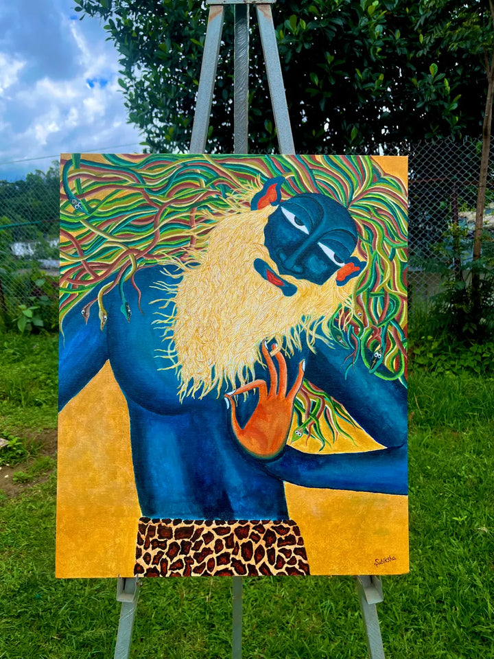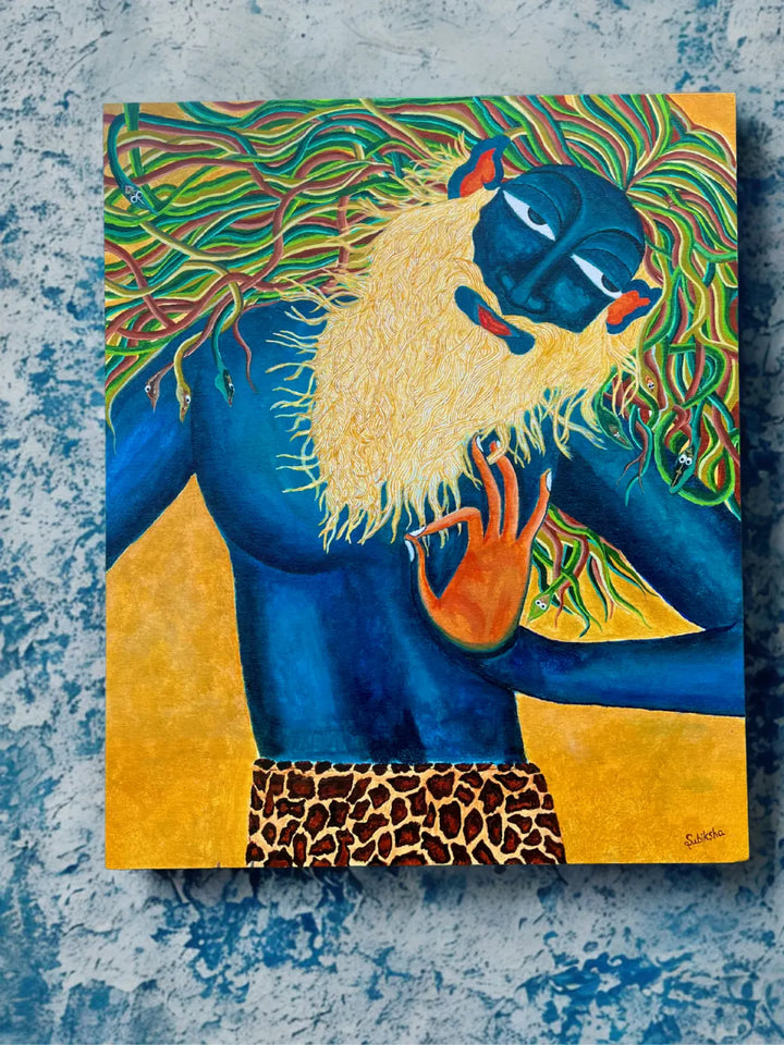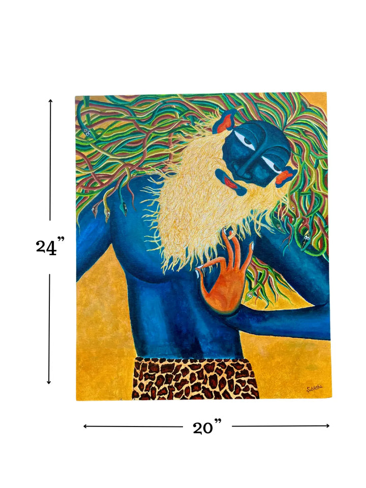 The figure, draped in deep blue, embodies stillness and awareness — a state beyond time. The flowing beard and root-like hair echo the cycle of growth, grounding the spirit to the earth while reaching outward to infinity. The leopard skin hints at raw instinct, reminding us that consciousness is not only divine but also deeply animal, earthly, and alive.