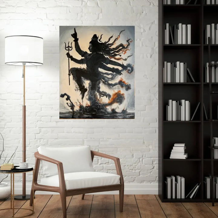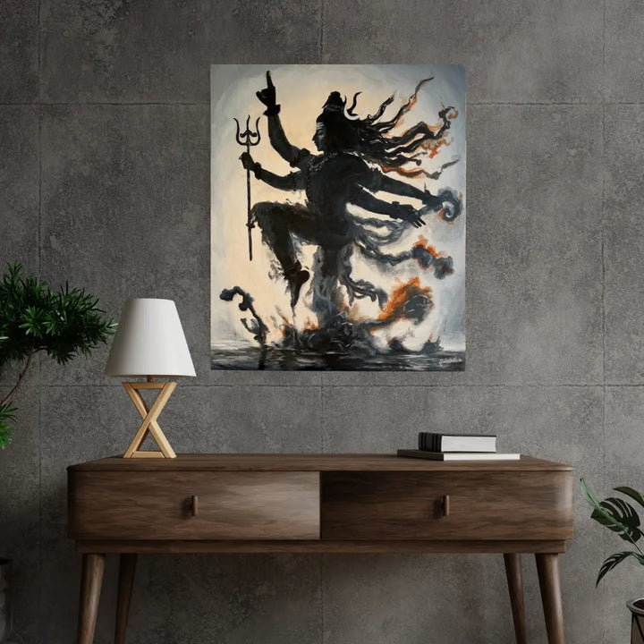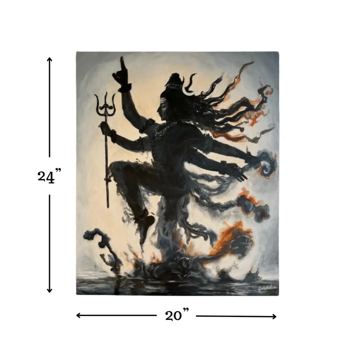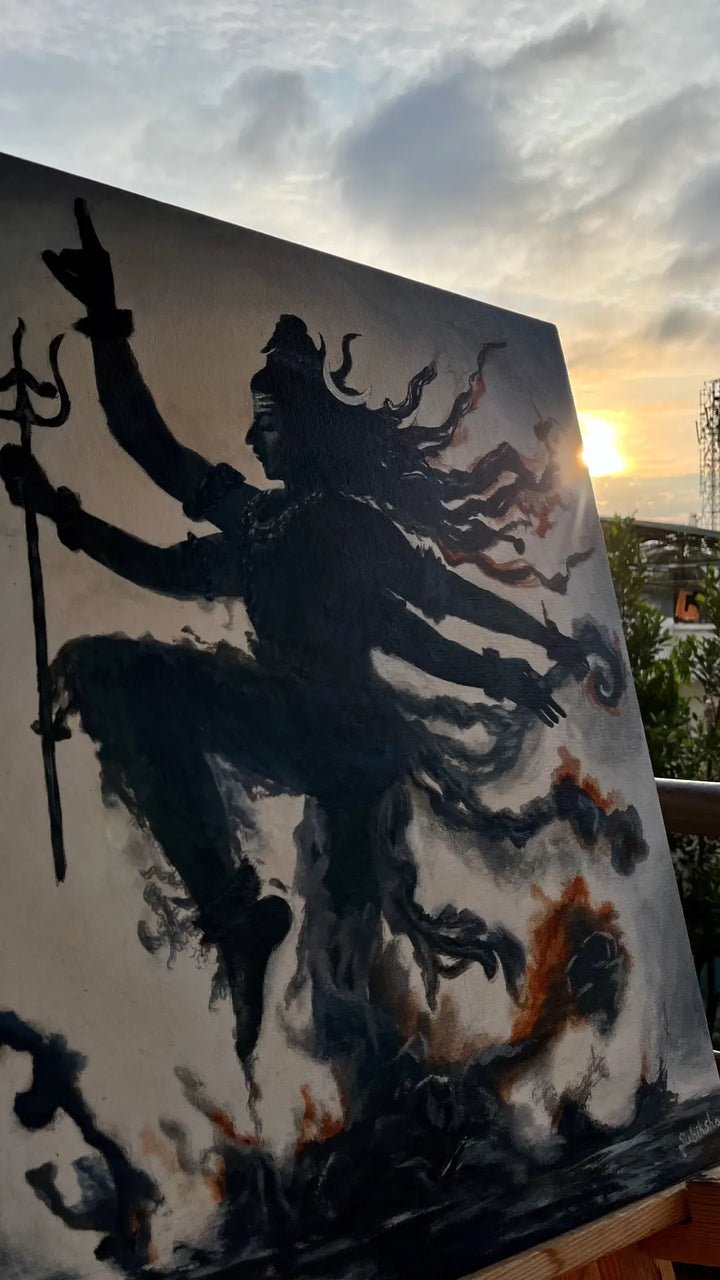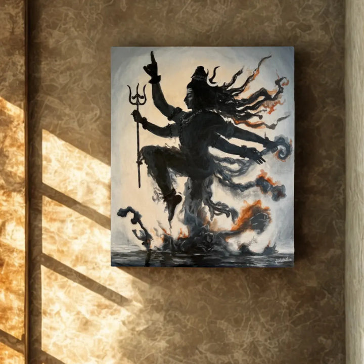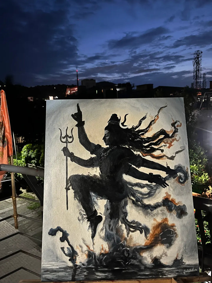 A powerful portrayal of Lord Shiva in his Nataraja form, The Cosmic Dancer captures the rhythm of creation, preservation, and destruction. Painted in bold strokes of black and grey with fiery accents, this artwork embodies divine energy in motion — the eternal dance of the universe.